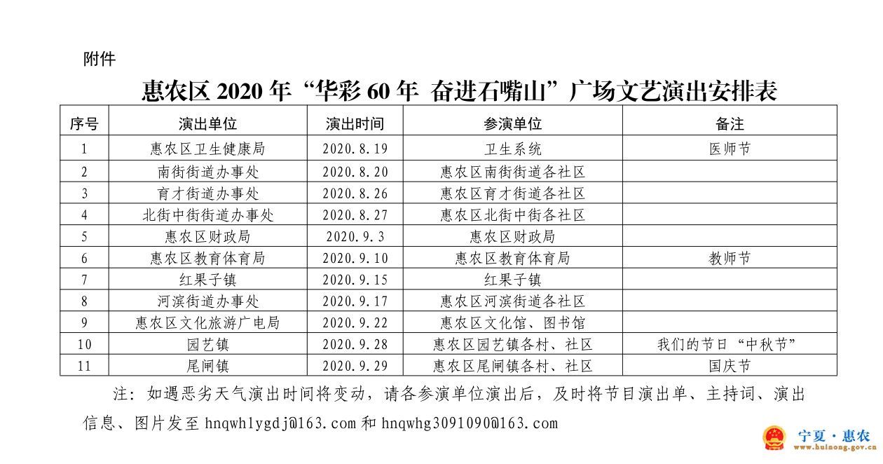 附件:惠农区2019年“华彩60年奋进石嘴山”广场文艺演出安排表