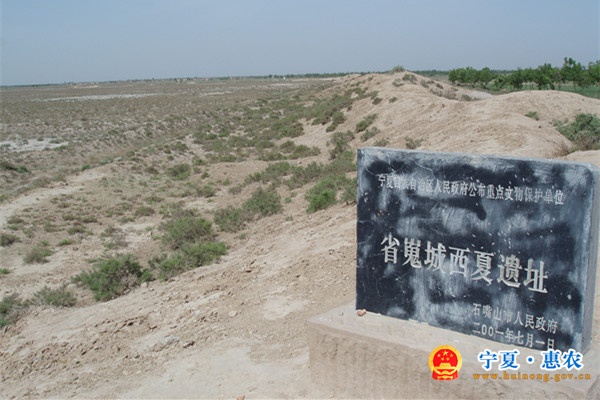 西夏遗址——省嵬城,坐落在惠农区城东南10公里处,东距黄河13公里。今城墙遗址十分明显,北墙最高达近3米。城呈正方形,城墙长600米,全城面积为36万平方米。