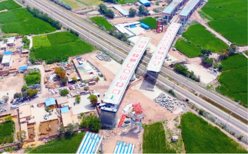 乌海至玛沁高速公路惠农(蒙宁界)至石嘴山段跨包兰铁路分离式立交桥转体中(无人机照片)。本报记者 孙燕红 摄
