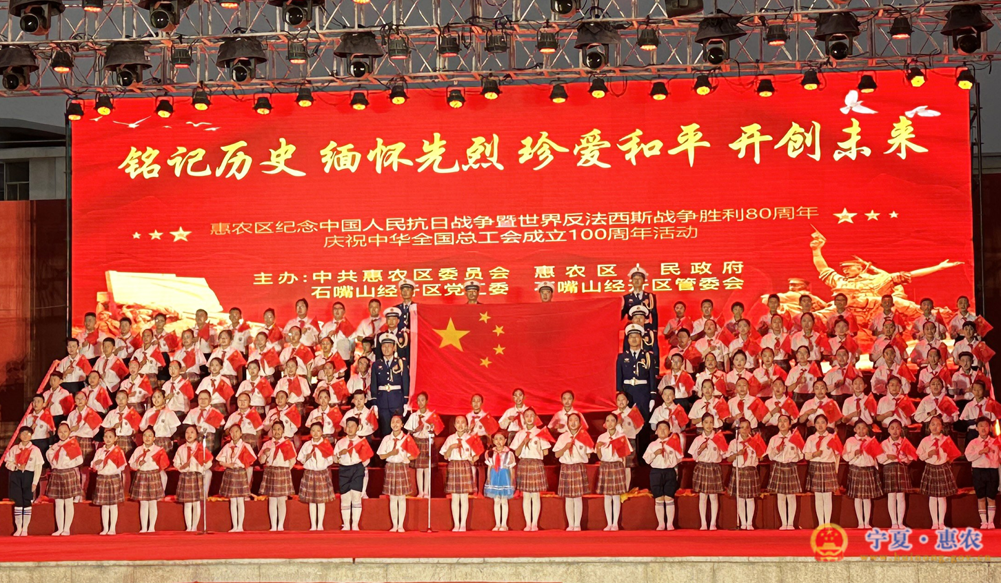 9月18日,惠农区文景广场华灯璀璨、歌声如潮,纪念中国人民抗日战争暨世界反法西斯战争胜利80周年、庆祝中华全国总工会成立100周年合唱活动在此盛大举行。1600余名来自全区各行业的职工与学生代表齐聚一堂,以激昂旋律回望峥嵘岁月,用嘹亮歌声礼赞劳动精神,奏响新时代奋斗强音。